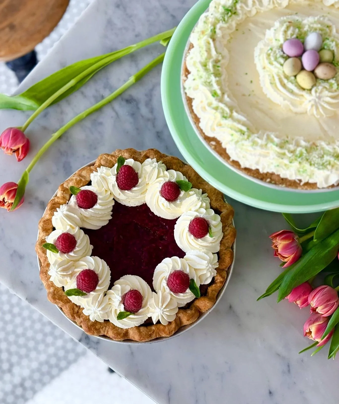 Double Lemon Cream or Chocolate Raspberry? Beautiful springtime pies are ready for your Påskebord.