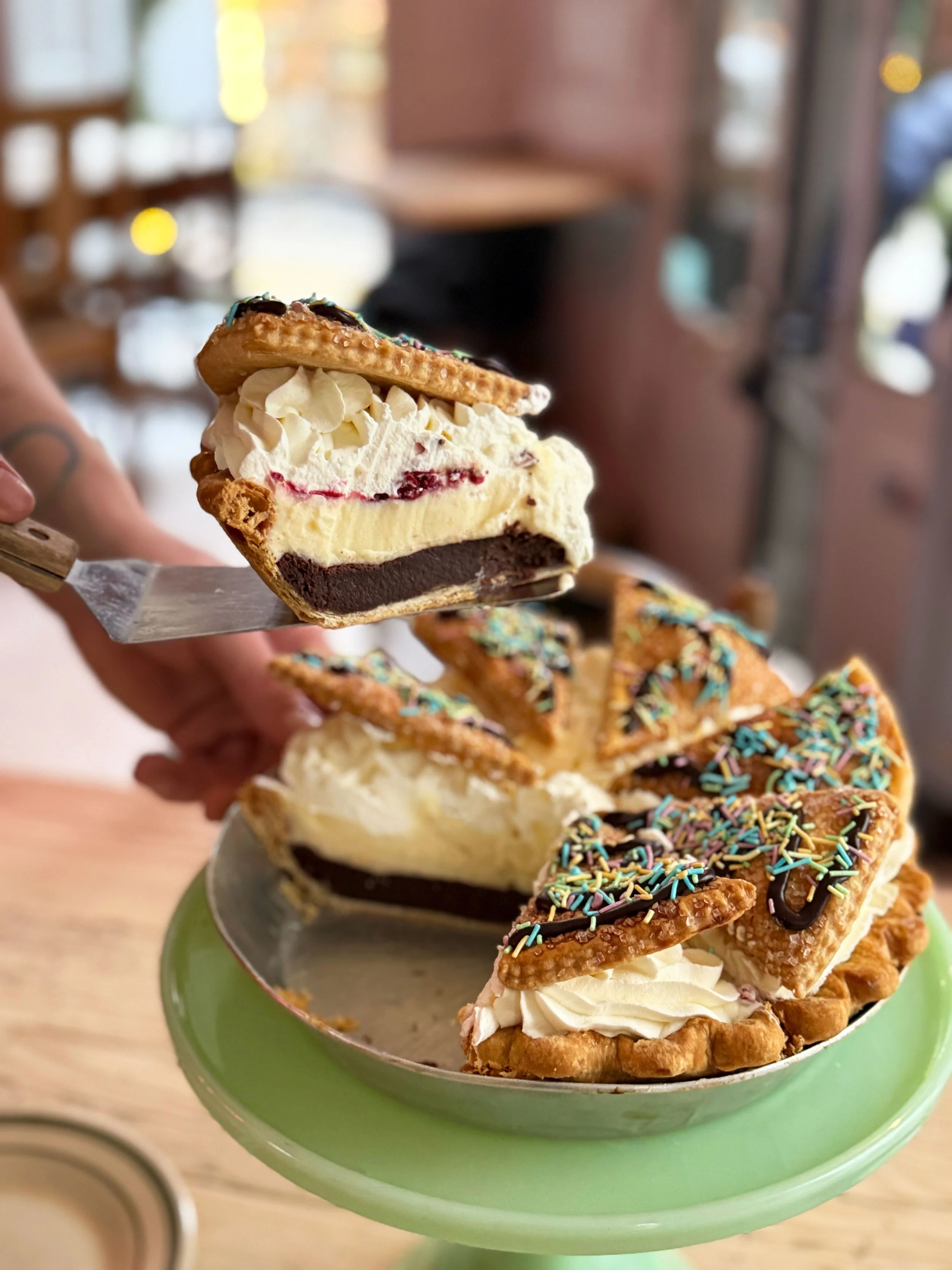 Fastelavn er mit navn…. Our “pie twist” on the Danish holiday bun is back! We take ALL the traditional fillings of dark chocolate, vanilla custard, tart raspberry and fresh whipped cream, and layer them into one decadent slice.