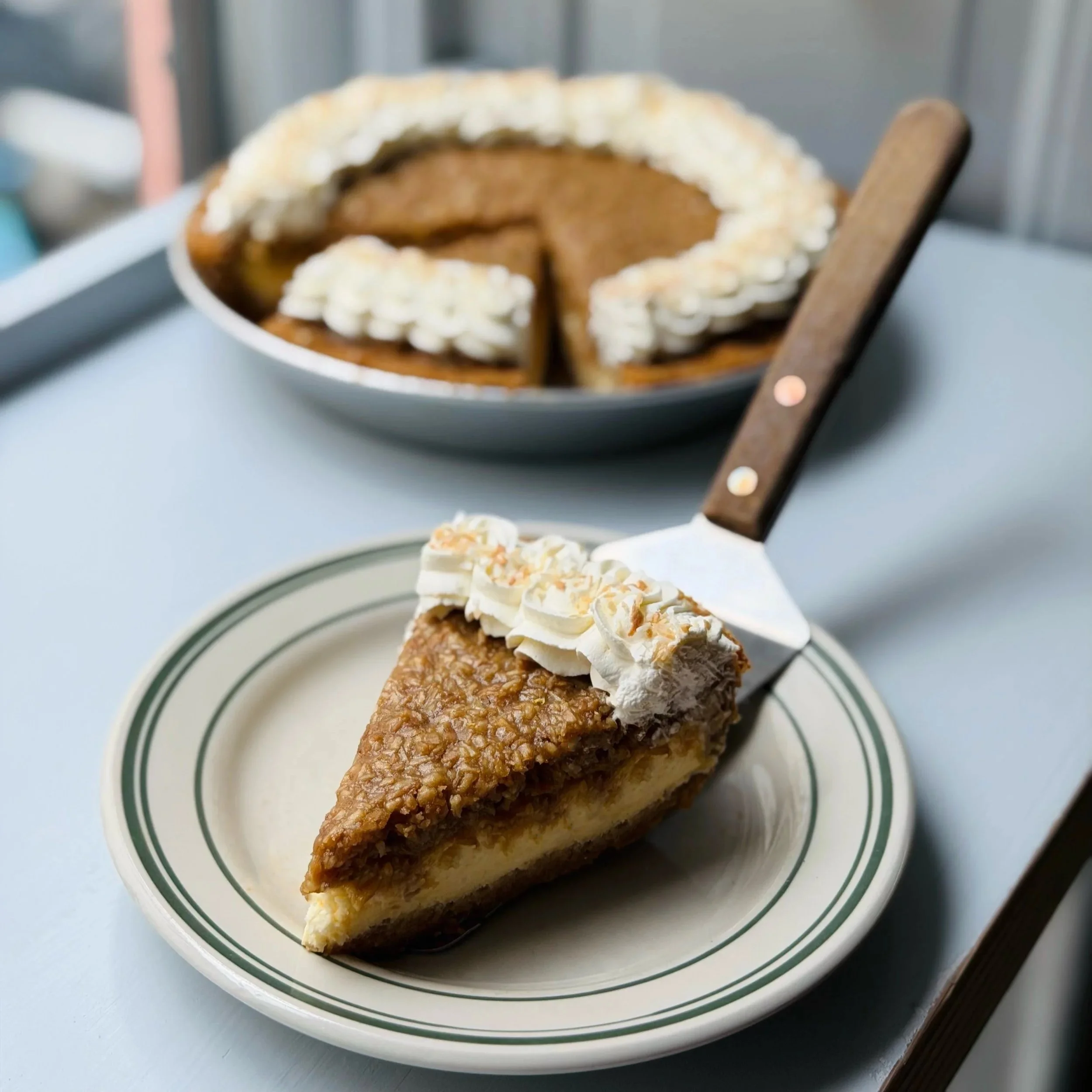 We added Denmark’s favorite topping to our favorite cheesecake! Toasted coconut folded into rich buttery caramel makes that infamous topping, then layer it on thick atop a classic vanilla cheesecake with cookie crust. Literally 2 dreams in 1 pie.